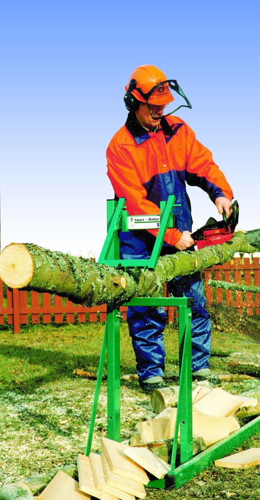 Le Smart-Holder est votre assistant pour maintenir le bois que vous débitez. Il fonctionne en quatre étapes simples : 1) Soulevez le support vertical et fixez-le avec les écrous papillons. 2) Réglez la mâchoire supérieure selon la taille de votre bois (25 à 32 cm). 3) Glissez le bois entre les mâchoires jusqu’à ce que les dents s’enfoncent. Pour scier, placez le bois du même côté que le support vertical et poussez la scie vers le bois.